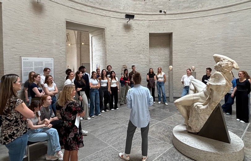 Anschließend ging es weiter zur Glyptothek am Königsplatz, um sich dort mit einigen „Highlights“ der antiken griechischen Kunst auseinanderzusetzen. Um den Schülerinnen und Schülern einzelne Exponate näherzubringen, übernahmen hier die begleitenden Lehrkräfte Frau Ilg, Frau Schrader, Frau Kaml und Frau Thalmeier die Rolle der Museumsführer und erläuterten spannende Details zu einzelnen Werken. So wurden das Sinnbild griechischer Lebensfreude, der „Barberinische Faun“, die eindrucksvoll in Marmor festgehaltene „Hochzeit des Poseidon“, die das einfache Leben der Menschen darstellende „Trunkene Alte“ und die Szenen aus dem Trojanischen Krieg zeigenden „Giebelfiguren des Tempels der Ägineten“ präsentiert.
